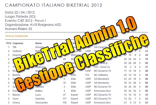 Cliccando sulla voce "Classifiche" nel Menù Principale, potete accedere alla prima versione della parte "user" di BTA 1.0. Il software BTA funziona già da due anni e viene utilizzato con successo nella redazione delle Classifche di gara BikeTrial. Da oggi, con questa nuova versione si affaccia la possibilità di visualizzare i risultati direttamente dal lato utente con una completa integrazione nel sito www.biketrialitalia.it .