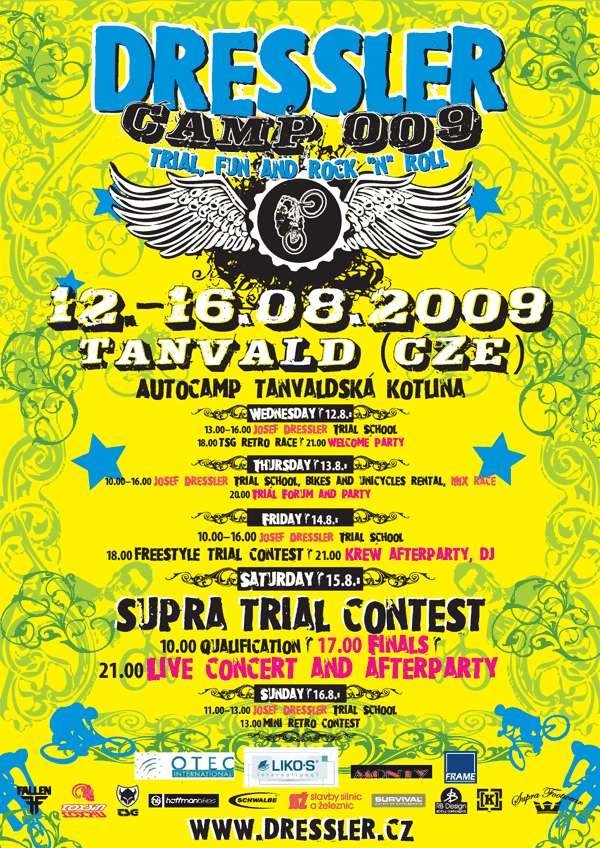 Durante la settimana ci saranno vari momenti di allenamento e intrattenimento. All'evento parteciperanno molti Elite internazionali ed inoltre la manifestazione ha assunto ormai il carattere di un vero e proprio evento internazionale a cui partecipano molti bikers da tutta Europa. Dressler Capm è prima di tutto un modo per stare insieme condividendo la passione per il BikeTrial, la scelta migliore ci pare sia quella di partecipare muniti di tenda e sacchi a pelo ma è possibile anche prenotare anche dei Bungalow. La manifestazione si svolge all'interno del circuito di Moto Cross di Tanvald.
