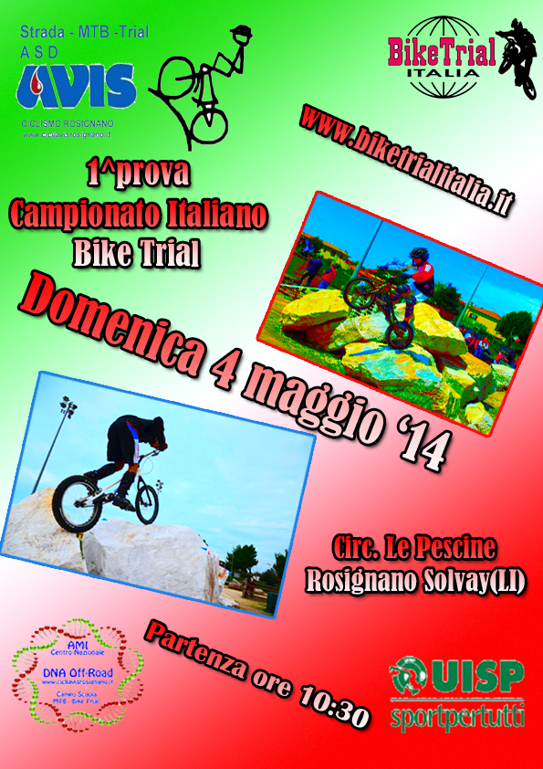 Il Campionato Italiano BikeTrial 2014 apre a Rosignano Solvay (Livorno) il 04 Maggio 2014 ad opera dell' AVIS Rosignano A.S.D. Tutte le categorie previste dal Regolamento sono ammesse per contendersi le maglie di Campione Italiano 2014. Ulteriori informazioni a breve su questo sito, come sempre le iscrizioni su BikeTrial Italia.