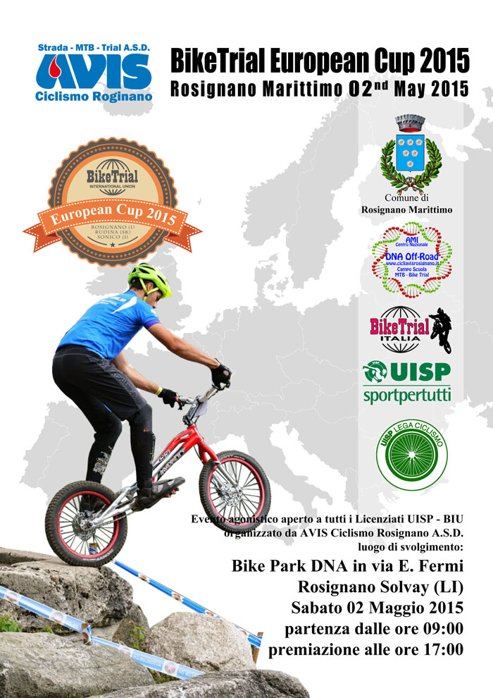 La seconda prova del Campionato Italiano 2015 si svolgerà in concomitanza con la Coppa Europa BikeTrial 2015 a Rosignano Marittimo il 02 Maggio 2015. La gara sarà aperta a tutti i Licenziati UISP e BIU nonchè ai Licenziati delle altre Federazioni della Consulta Nazionale Ciclismo. Sarà un'ottima occasione per incontrare e confrontarsi con i migliori Riders di tutta Europa in puro spirito "BikeTrial" ovvero: sfida sincera ed amicizia. Non perdete quindi questo importante appuntamento che AVIS Ciclismo Rosignano A.S.D. stà preparando con la massima cura.
