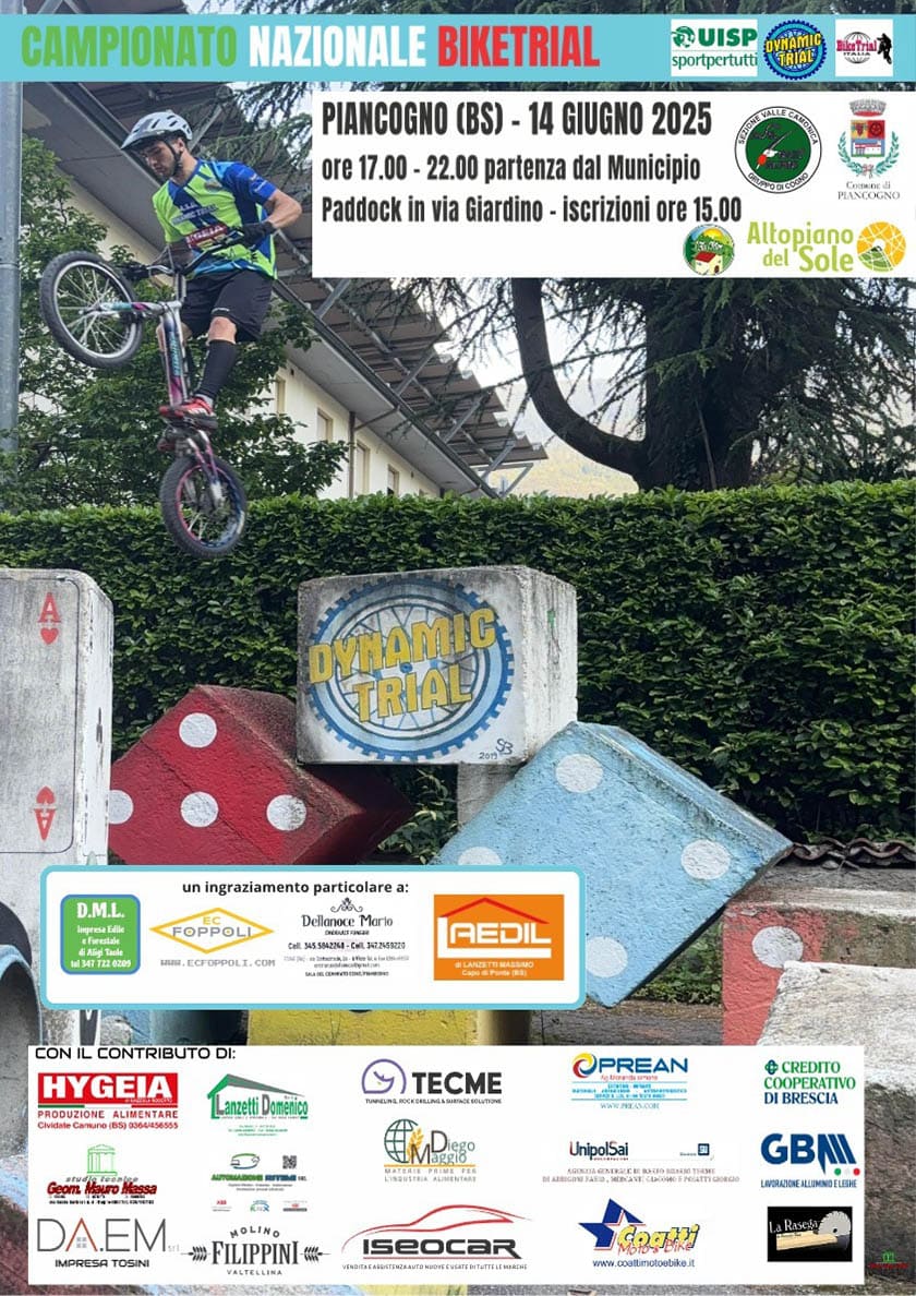 SABATO 14 Giugno 2025 dalle ore 15:00 a Piancogno (BS) si svolgerà la seconda prova del Campionato Nazionale Italiano di BikeTrial 2025. Manifestazione organizzata dalla A.S.D. Dynamic Trial