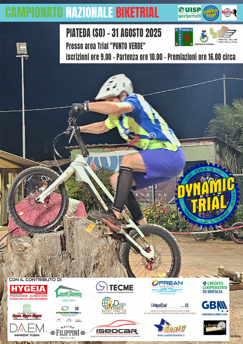 La Dynamic Trial in collaborazione con il Moto Club Valtellina capeggiato dall'amico Jonata Della Rodolfa vi attendono Domenica 31 Agosto 2025 dalle ore 9:00 a Piateda, Sondrio, per l'ultima prova del Campionato Nazionale Italiano BikeTrial. Sarà l'ultima occasione dell'anno per sfidare i vostri antagonisti su zone naturali ricavate all'interno della Area Trial Punto Verde.
